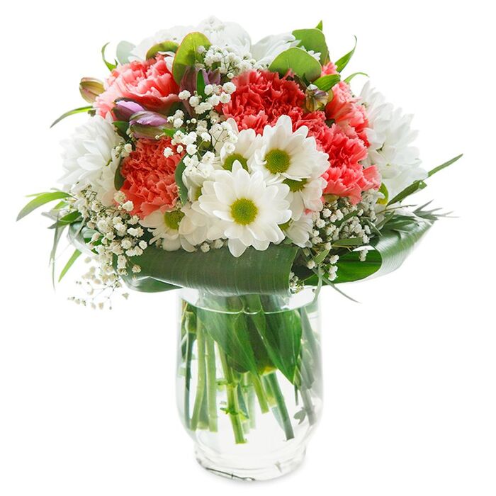Bursting with local charm and uplifting colour, this stunning bouquet feels like a celebration of Thornton Heath's own vibrant spirit, ready to brighten someone's day. Inside a spotless square white gift bag, ruffled carnations in shades of coral, peach, and red mingle joyfully, their rich petals echoing the lively blooms seen in nearby residential gardens. White daisies, with joyful green-gold centres, sit amongst the arrangement, radiating optimism like a warm morning by Thornton Heath's Trumble Gardens. Subtle sprays of baby's breath bring a cloudlike softness, weaving delicately through the blossoms, while hints of tightly furled purple buds add hidden intrigue along the arrangement's edge. Deep, shiny green foliage fans outward, cloaking the bouquet in a natural embrace and creating a lush, rounded silhouette that feels both abundant and inviting. The white gift bag, fitted with sturdy white ribbons for easy carrying, elevates the presentation, perfect for gifting on special occasions-from birthdays and anniversaries to moments of heartfelt kindness shared along Brigstock Road. Framed by a clean white background, every detail-colour, texture, and expert composition-comes alive, telling a story of freshness and thoughtful craftsmanship from a trusted local florist. Florist Thornton Heath's passion and artistry shine in each carefully chosen stem, making this bouquet a truly memorable gesture for any treasured recipient in the community. This exquisitely composed bouquet shines in the gentle light of a Thornton Heath morning, bringing together cheerful white daisies with lively lime centers, plush coral-pink carnations, and clouds of white gypsophila. Each blossom is thoughtfully placed, creating a circular, harmonious arrangement that mirrors the welcoming community spirit found in the neighbourhood's parks and street markets. The ruffled texture of the carnations imparts both warmth and movement, while delicate baby's breath and slender alstroemeria buds-tipped with blush and purple-whisper promises of continued blooming and renewal. Silvery eucalyptus weaves through the greenery, imparting a subtle scent and a soft matte counterpoint to the vivid blossoms. Framed by rich, variegated foliage, the bouquet's colours and forms are highlighted by the crisp white background, inviting the eye to savour every nuance. Perfect for moments of celebration or gentle encouragement, this bouquet captures the essence of spring and the artistry of Thornton Heath florists, delivering uplifting beauty and a touch of floral serenity to any home or workplace. Bathed in gentle daylight against a pure white backdrop, this bouquet feels as cheerful and uplifting as a spring afternoon in Thornton Heath. A vivacious cluster of coral-pink carnations forms the heart of the arrangement, each ruffled blossom bursting with colour and movement. Crisp white daisy-like chrysanthemums and sweet, classic white daisies with lively green centres punctuate the design, reminiscent of fresh flowers seen in Surrey Gardens on a sunny weekend. Wispy sprays of baby's breath, soft and delicate, float throughout, giving the bouquet a graceful lightness and sense of calm. Along one edge, unopened magenta alstroemeria buds add depth and promise, while an abundance of glossy, deep green leaves cradles the base and peeks up between petals. All are gathered in a transparent glass vase filled with clear water, the green stems visible beneath the surface, symbolizing freshness and attentive local floristry. This joyful composition would make an ideal gift to mark a birthday, say thanks, or simply illuminate a Thornton Heath home with its inviting presence and gentle fragrance.